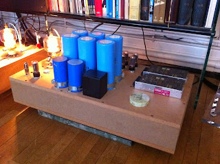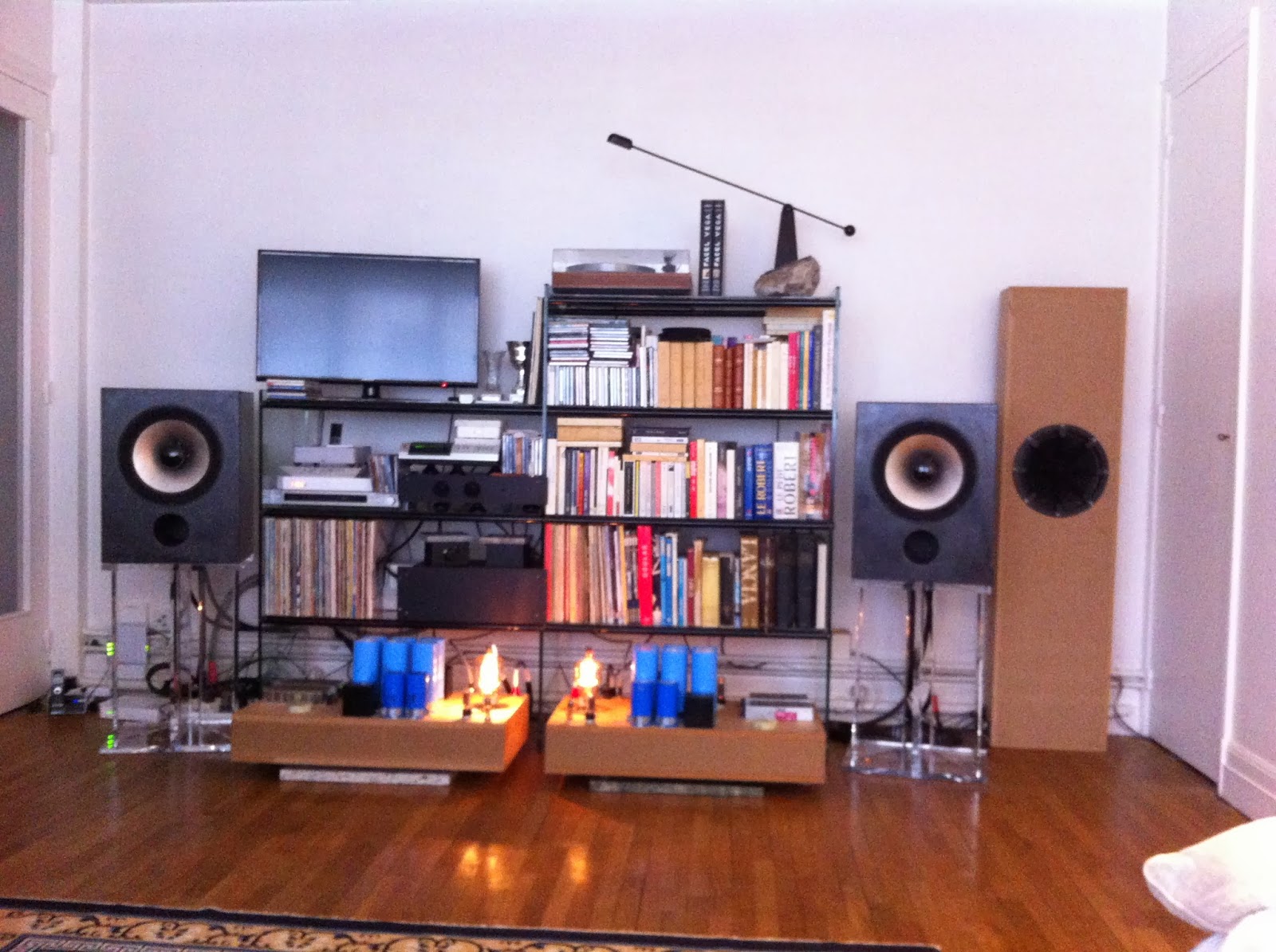 J’avais été séduit sur le salon par ces enceintes en pierre bleue avec un seul haut parleur large bande EMS 12″. Je les retrouve donc dans un séjour soutenues par un caisson de grave actif en classe D (module IcePower), encore à l’état de prototype et alimentées par 2 blocs mono à tubes de 15w à l’état de prototype également.