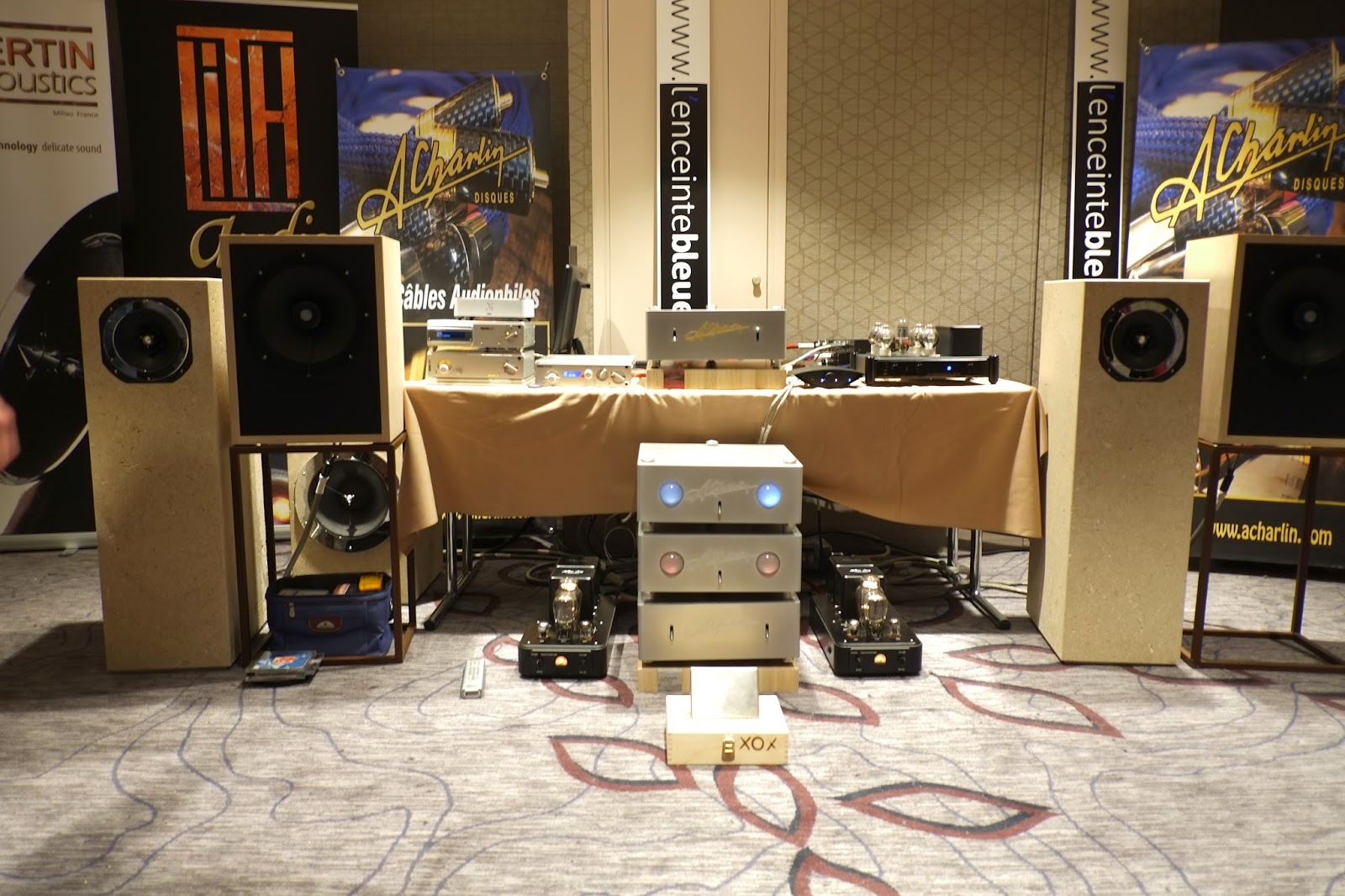 Dans cette même salle, il faut aussi parler du formidable rapport qualité/prix des électroniques Ming Da qui présentaient des blocs mono avec un tube 300B et un 805. Ces ampli alimentaient sans problèmes les enceintes de Dominique Mafrand, comme les Lith en pierre utilisant un haut-parleur Fertin sans suspension.  L’année dernière, j’avais été assez emballé par l’enceinte bleue en pierre avec son large bande. Cette année, Dominique a fait évoluer son 30 cm en lui associant en son centre un tweeter qui améliore grandement le détail dans l’aigu et lui permet de monter plus haut. Par contre, si le passage à une caisse bois/alu présente un intérêt économique évident pour le consommateur, on a perdu à mon sens certaines qualités à l’écoute. A noter que ce système bénéficiait comme sources d’une ensemble transport + DAC Nagra d’un très haut niveau. Finalement des deux enceintes à l’écoute, ce sont les Lith qui m’ont le plus enthousiasmé. Comme quoi la rigidité de la caisse, ça compte. Un seul regret : ne pas avoir entendu du week-end le caisson de grave prévu pour épauler les colonnes dans l’infragrave. A priori les specs de cet HP sont très intéressantes pour un subwoofer audiophile.