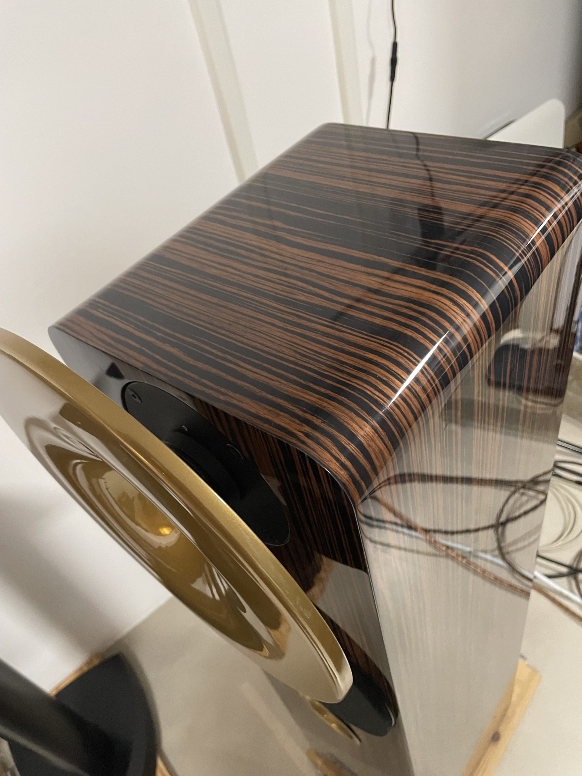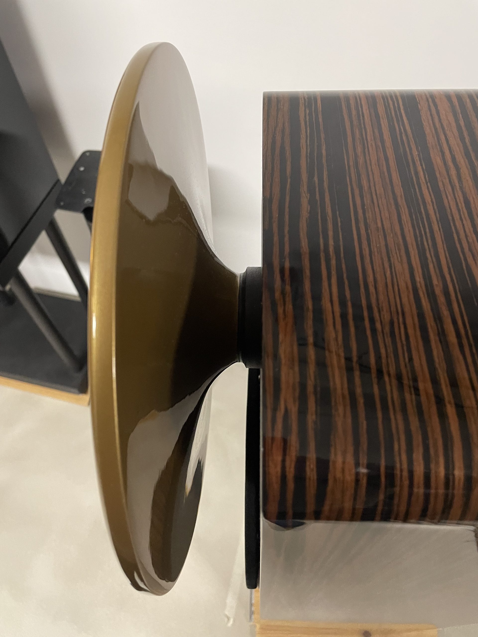 Avant que la musique jaillisse, c’est la finition qui interpelle. Elle est vraiment superbe cette enceinte. Le fabricant propose pas moins de 20 finitions de bois et toutes les teintes RAL au choix pour le pavillon et l’event. Et cela sans supplément de prix ! Chose assez rare pour le souligner.