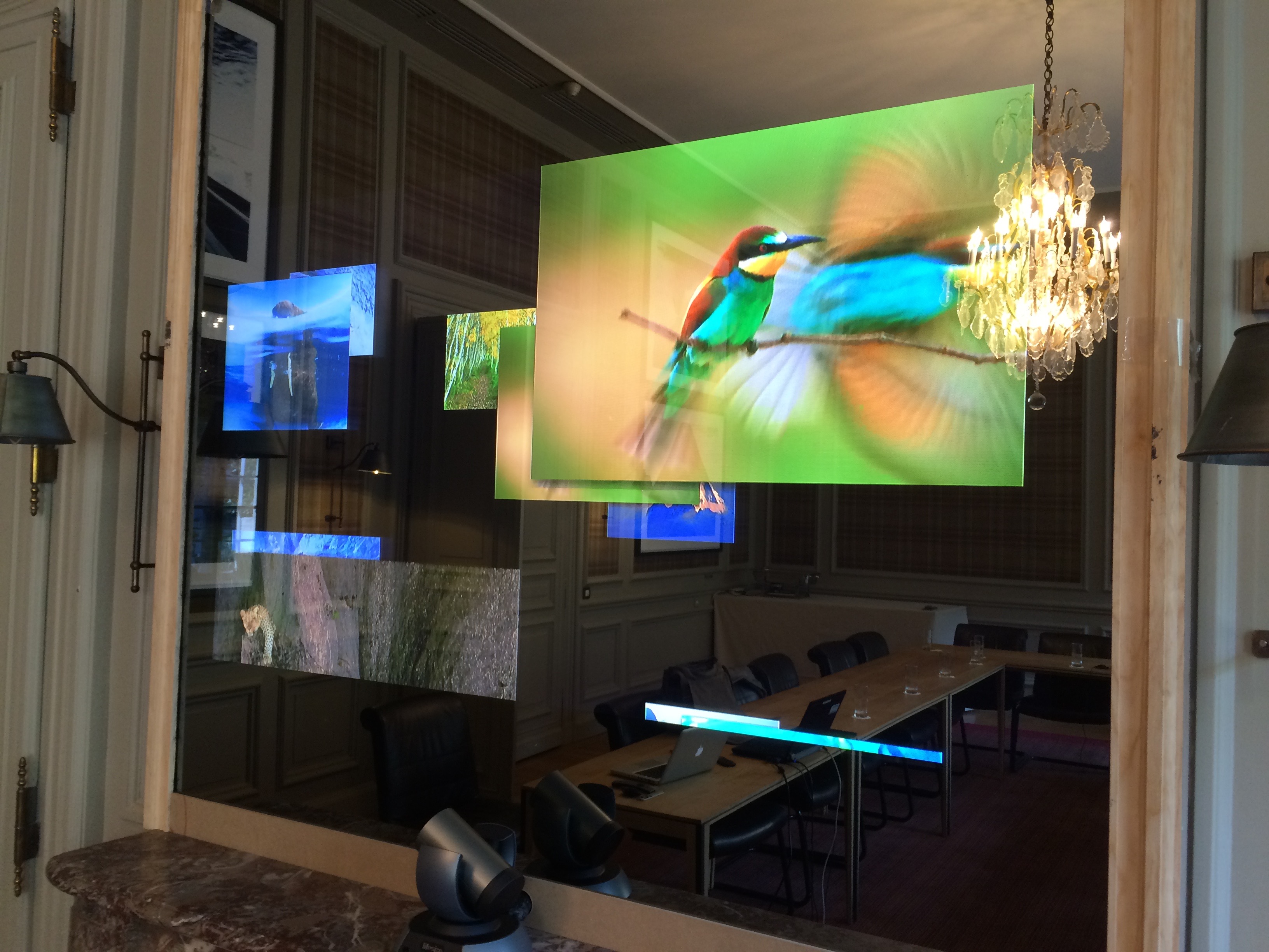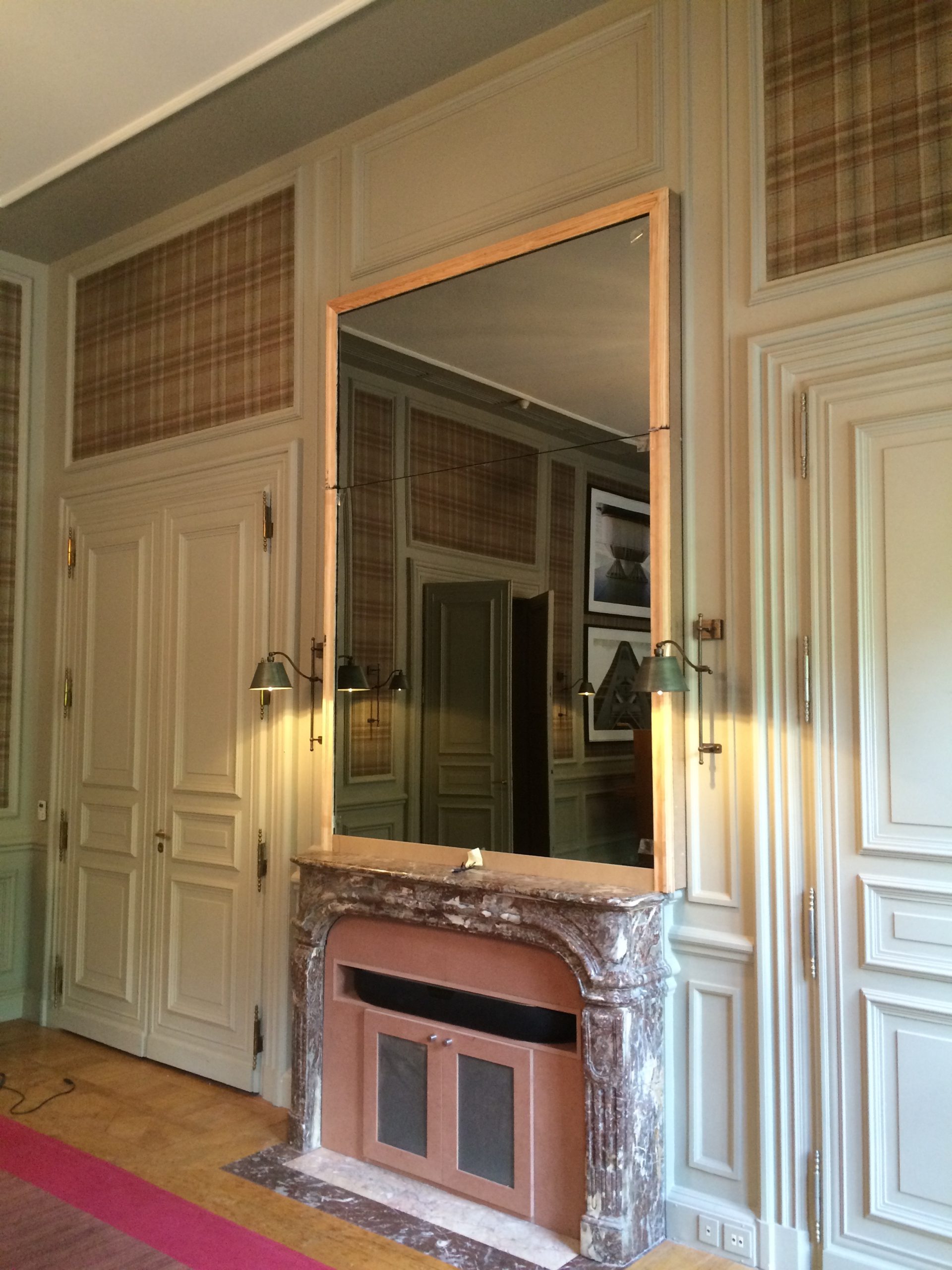 Dans un bâtiment hausmannien classé, démontage d’un miroir pour remplacement par un miroir contenant un ecran 55′ avec système de visioconférence,