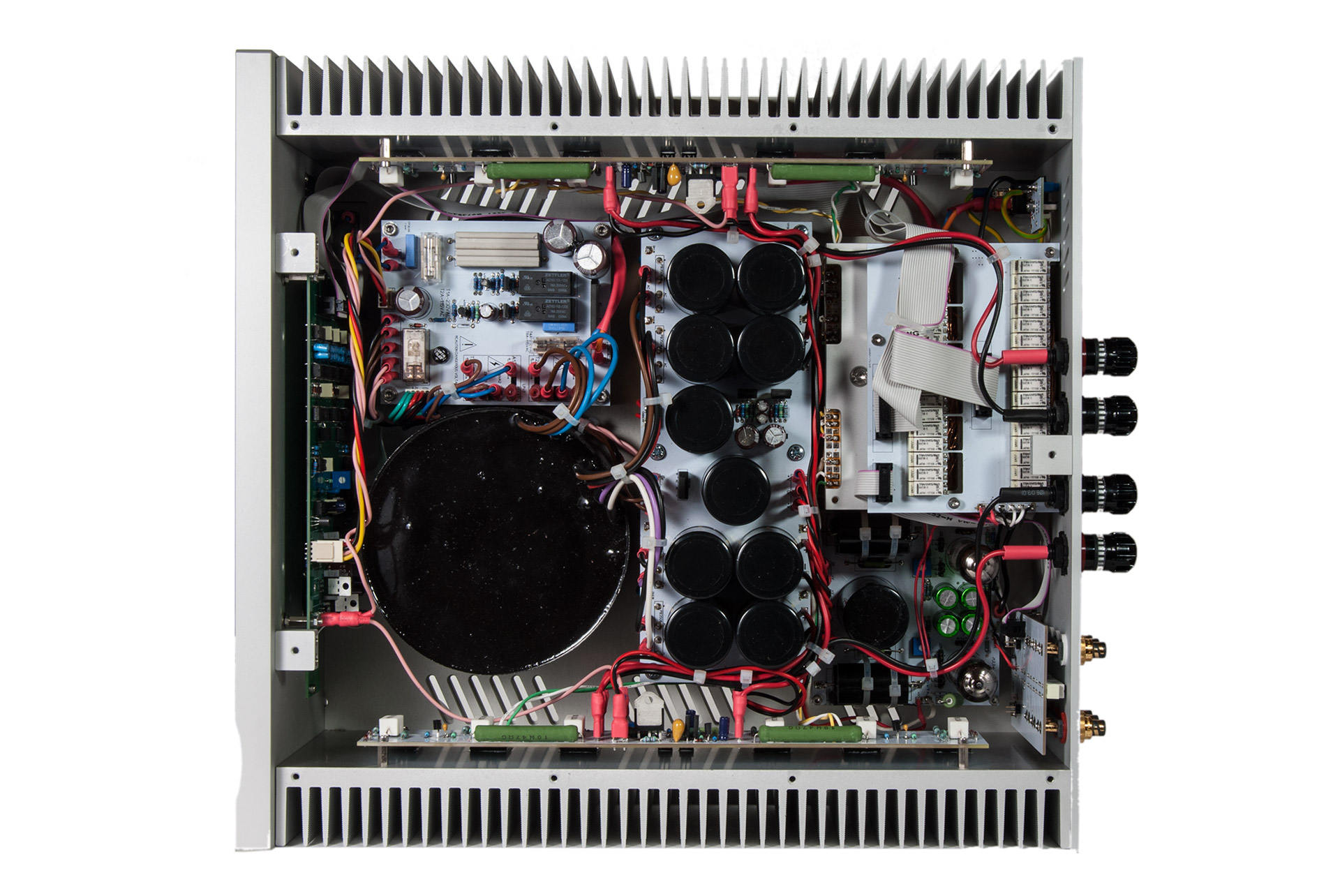 L’amplificateur adopte une construction solide, avec un châssis robuste (400 × 185 × 425 mm) en aluminium, un poids de 35 kg et une architecture pensée pour minimiser les interférences et la distorsion.