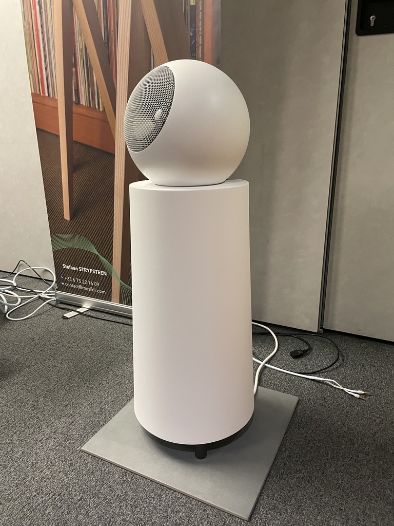 Le principe : un haut-parleur de grave de 220 mm orienté vers sol (“floor-firing”), couplé à un module sphérique séparé intégrant la section médium-aigu coaxiale (176 mm + 25 mm Al/Mg) : cette architecture permet de limiter fortement les réflexions indésirables (plancher, flancs) et de recentrer l’image sonore sur l’enregistrement, non sur la pièce.
