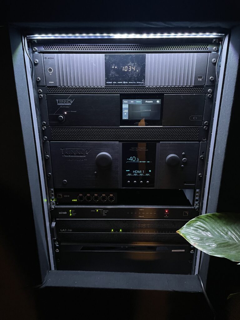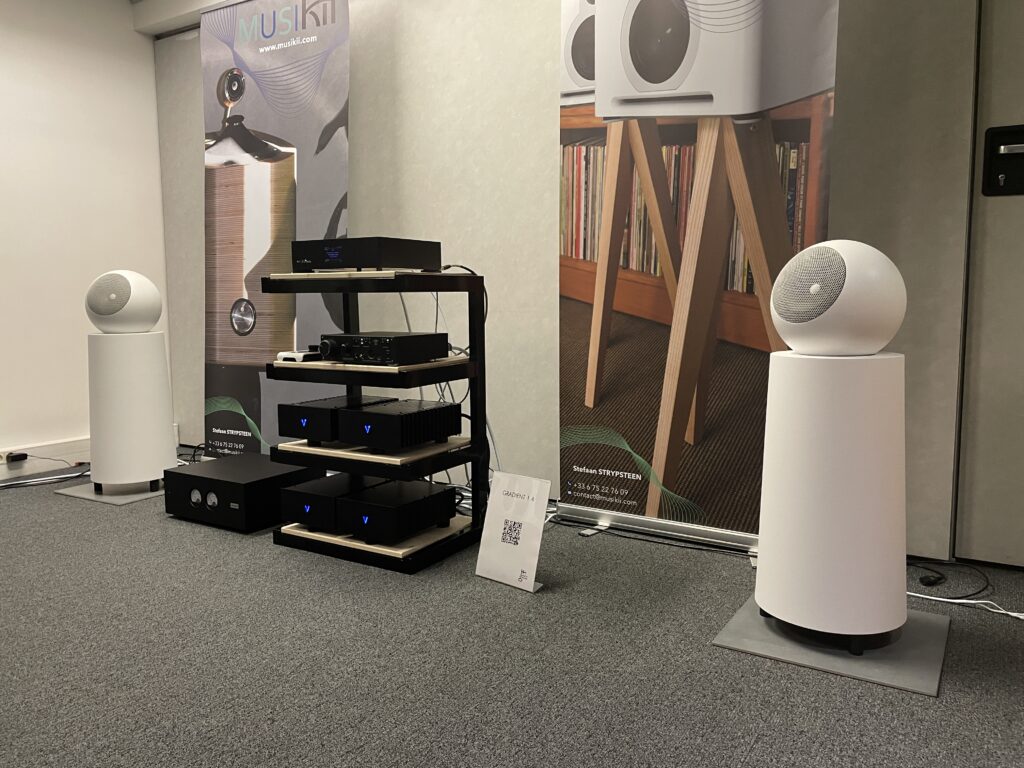Ces belles dans leur coffret en résine, étaient alimentées par un ensemble Valvet A4e Classe A comprenant 2 blocs mono avec leur alimentations respectives. La source était un serveur/streamer Grimm.