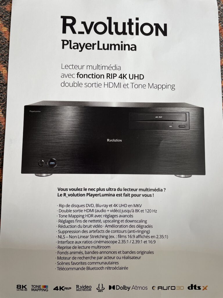 A noter également sur cette salle l’annonce d’une nouveauté promise à un gros succès. Il s’agit du R_volution Player Lumina ( dont mes photos sont complètements flou, désolé, sans doute l’émotion). Ce lecteur multimedia peut contenir jusqu’à 24To de stockage et dispose d’une unité de ripping 4K. j’ai même entendu certains parler d’un traitement d’image MADVR. A suivre avec le plus grand intérêt.