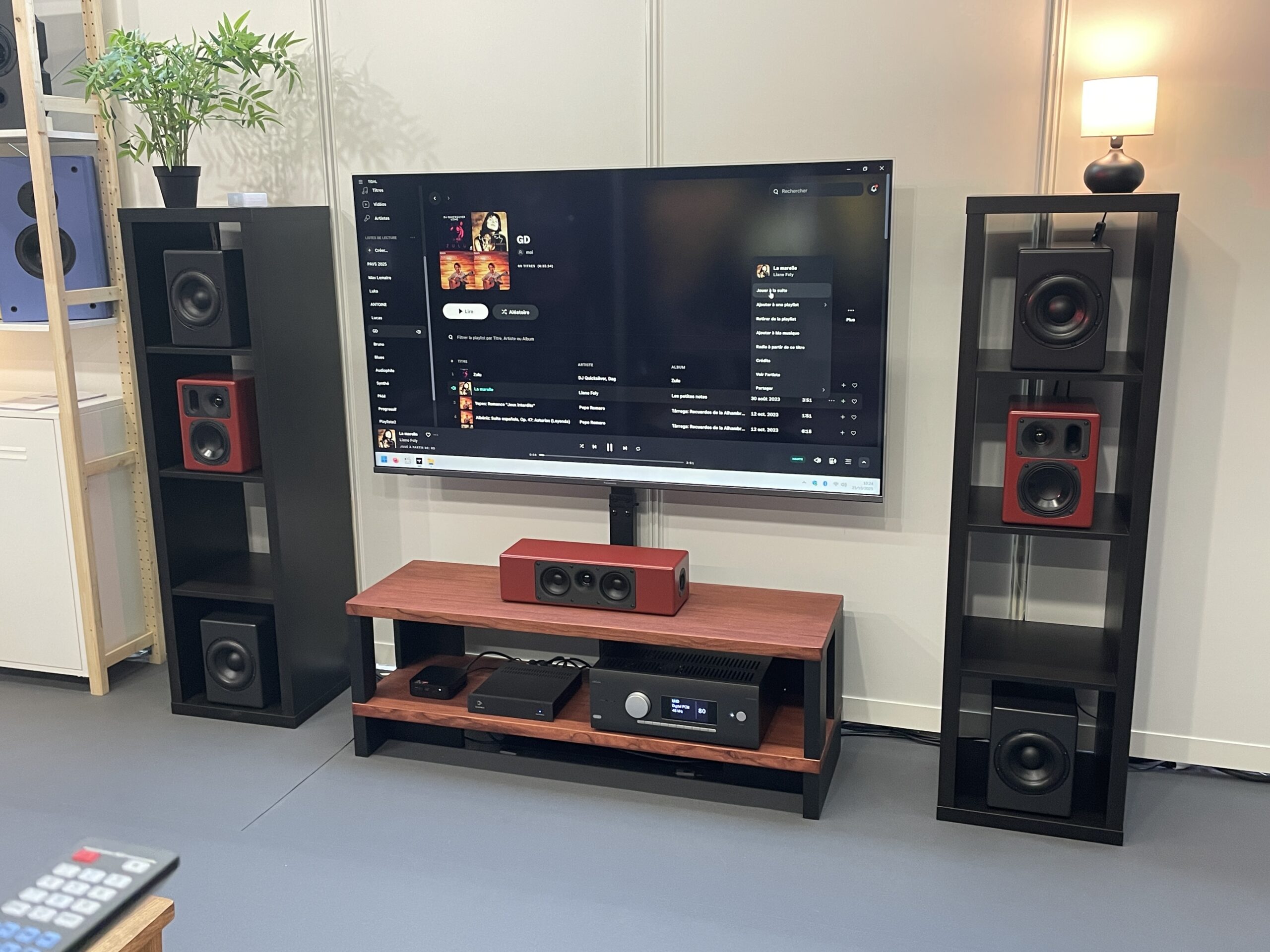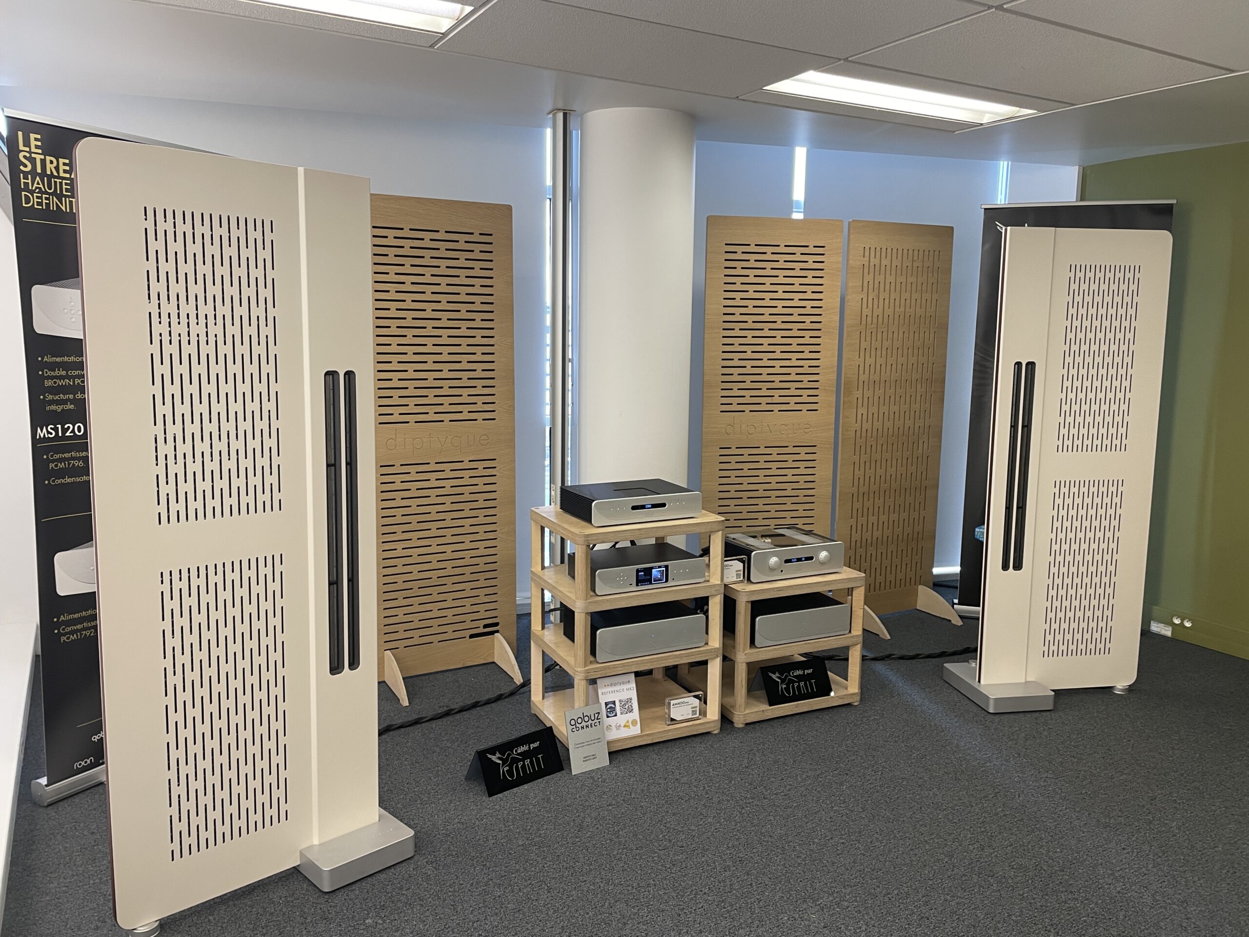 Ces belles dans leur coffret en résine, étaient alimentées par un ensemble Valvet A4e Classe A comprenant 2 blocs mono avec leur alimentations respectives. La source était un serveur/streamer Grimm.
