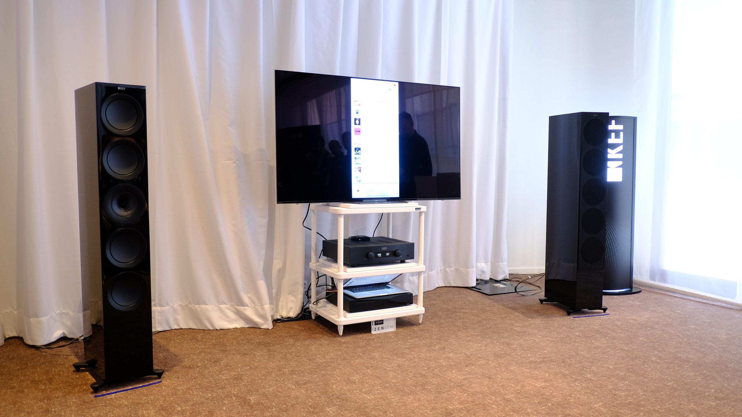 - Kii et Innuos. L’importaeur belge présentait les Kii Three actives à l’écoute avec leur caisson BXT pour les transformer en colonne très performante, puisque tout d’un coup équipée de 16 haut-parleurs de grave supplémentaires. Le serveur innuos dans sa version statement, la plus haut de gamme accompagnait dignement ces belles enceintes.