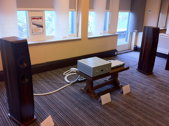 Dans une pièce ridicule avec 2 rangées de chaises, quasi sur les enceintes, nous sommes restés scotchés par une paire de petites bibliothèques les Gibbon 3XL. Impressionnantes sur tous les types de musique proposée avec un grave étonnant pour cette toute petite caisse. Une association très réussie avec les électroniques anglaise AMR ( un intégré hybride + une source). 5000€ la paire de mémoire.